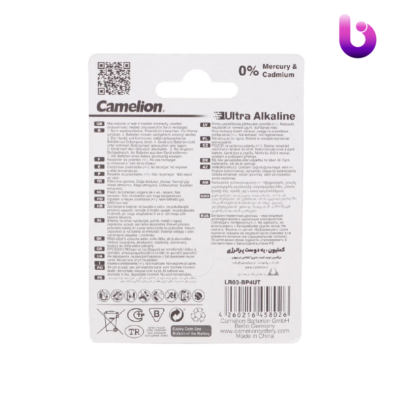 باتری 4تایی نیم قلمی کملیون مدل Ultra Alkaline LR03-BP4UT با ولتاژ ۱٫۵ ولت