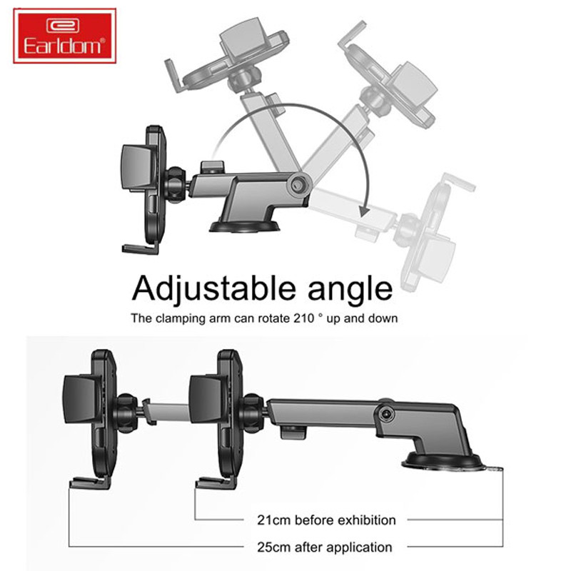 امکان تنظیم زاویه بازو توسط کلید فیزیکی چرخشی تا ۲۱۰ درجه و تنظیم ارتفاع بازوی نگهدارنده تا حداکثر ۲۵ سانتی متر جهت دسترسی آسان تر به گوشی موبایل