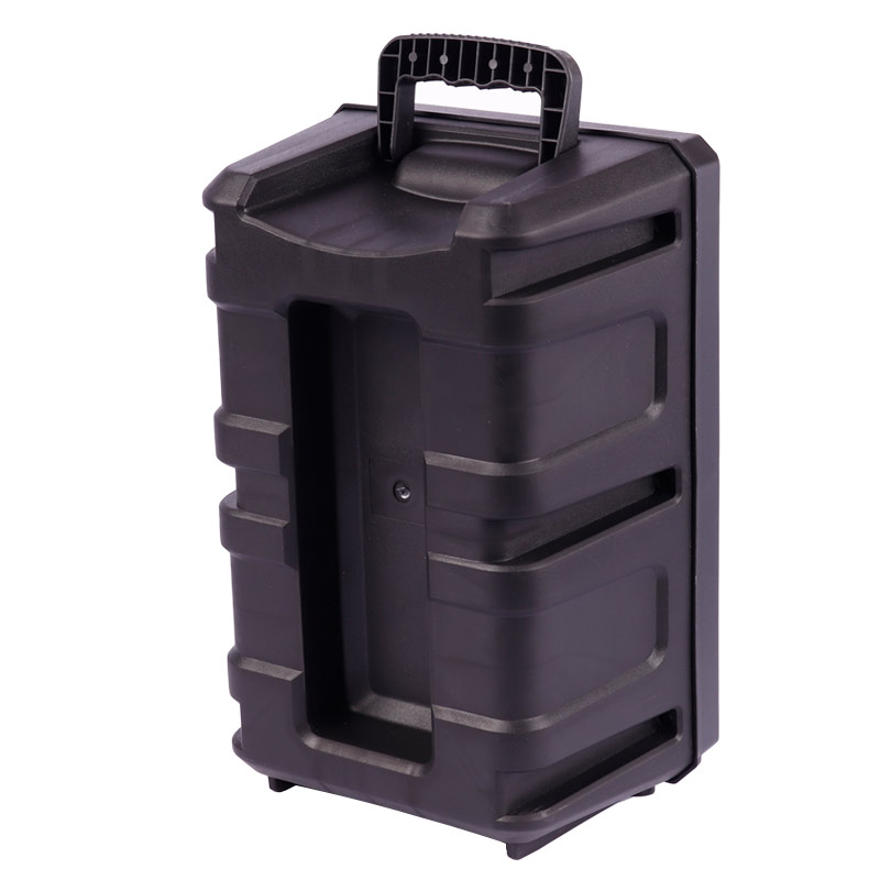بدنه ساخته شده از جنس پلاستیک مقاوم در برابر فشار، ضربه و آسیب های فیزیکی، مجهز به دسته جهت سهولت در حمل و نقل اسپیکر، دارای جایگاه قرارگیری میکروفون در قسمت پشتی بدنه