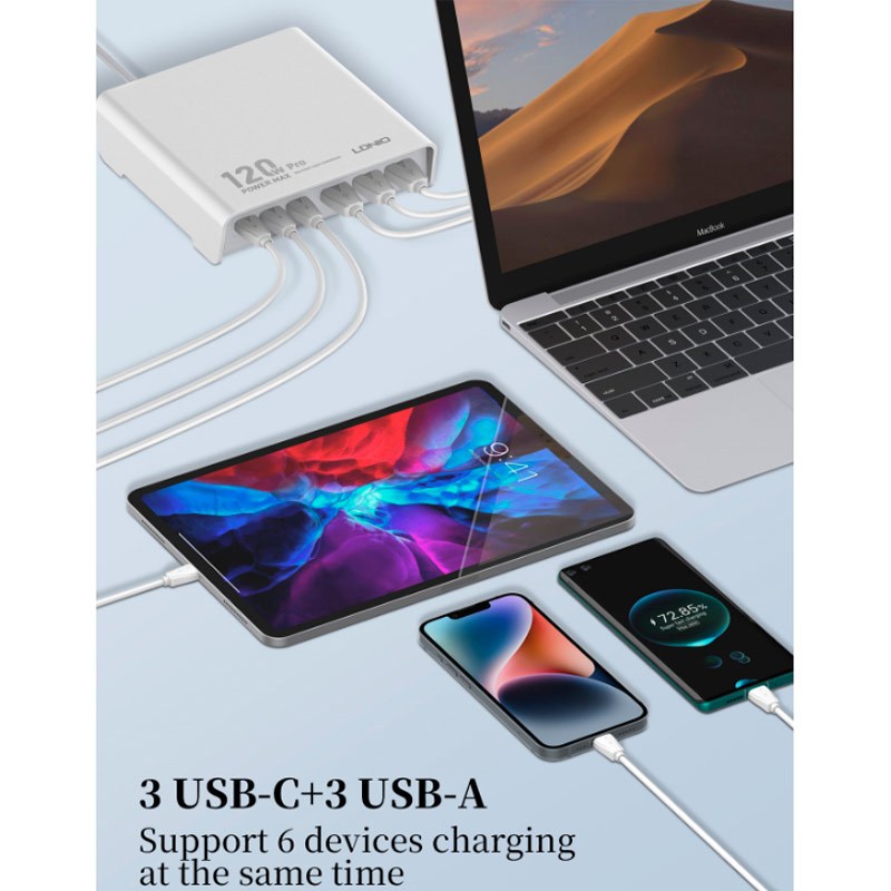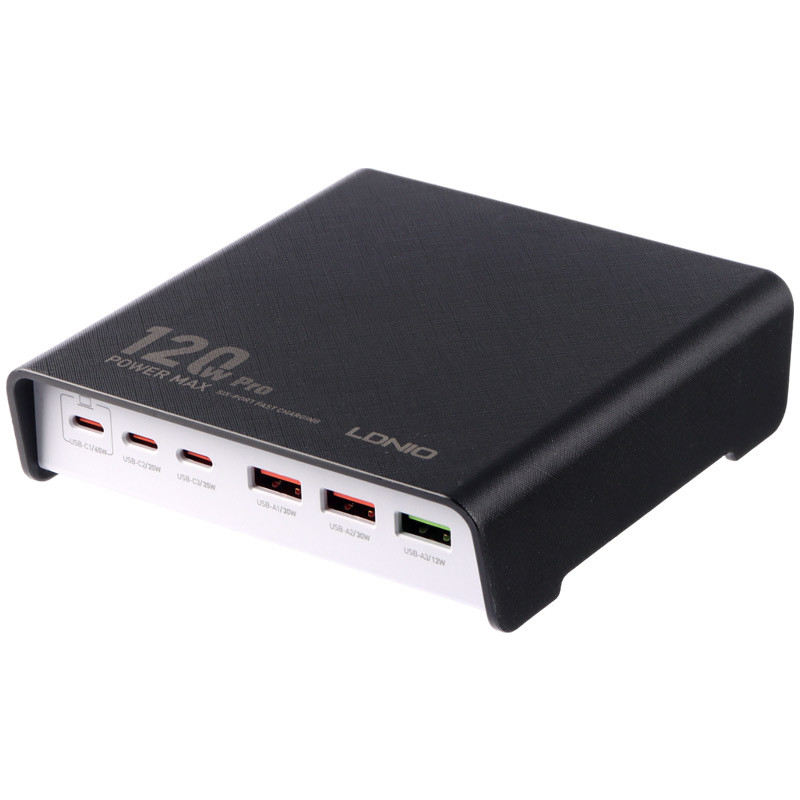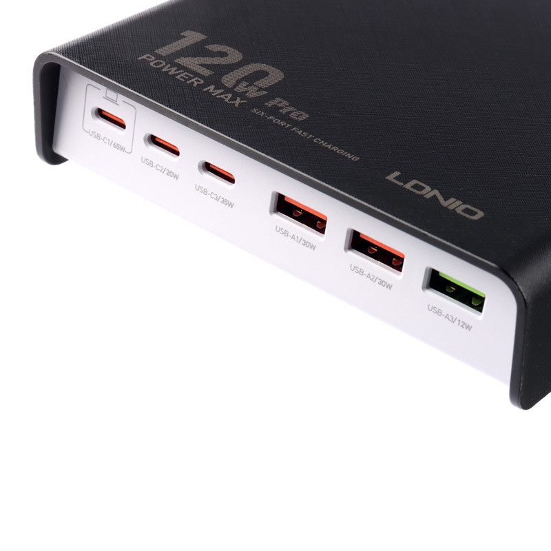 دارای شش پورت خروجی با قابلیت شارژ همزمان شامل 3 عدد پورت تایپ سی و سه عدد USB، پشتیبانی از فناوری های شارژ سریع QC3.0 و PD3.0