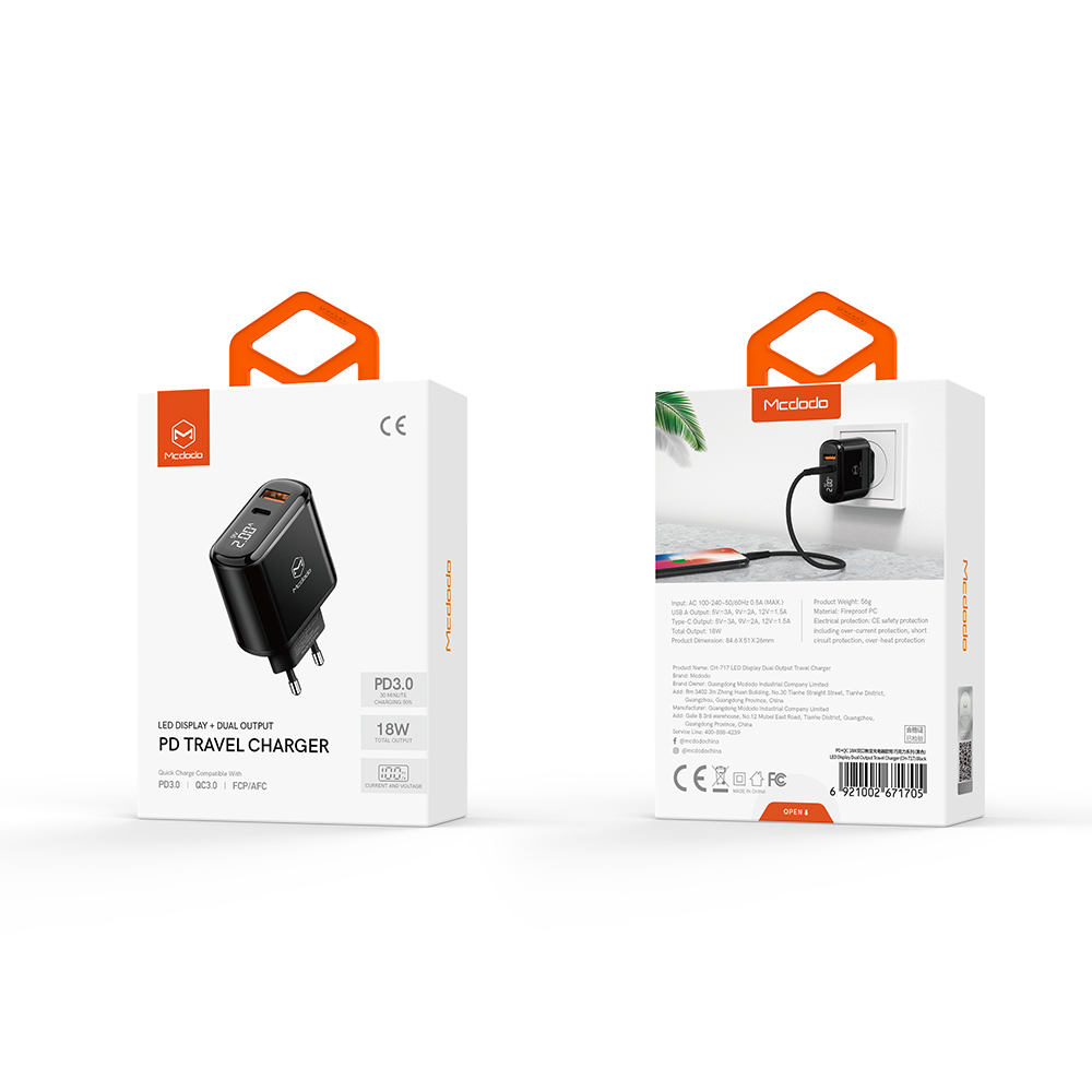 شارژر دیواری Mcdodo CH-7170 دارای دو خروجی است. یک خروجی USB که ار فست شارژ Qualcomm 3.0 پشتیبانی می کند و برای پورت خروجی دوم اگر گوشی شما آیفون ۱۱ یا مک بوک یا گوشی های دیگری که از PD استفاده می کند، باشد یک خروجی تایپ سی PD هم برای شما در نظر گرفته شده است.