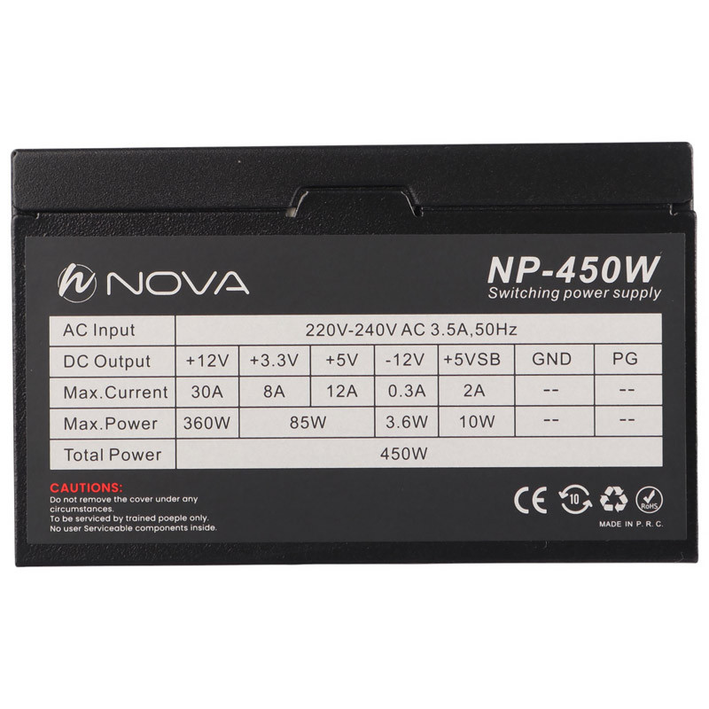منبع تغذیه NP-450 برند نوا از نوع غیر ماژولار بر اساس فرم فاکتور ATX طراحی شده است که برای انواع سیستم ها با مادربردهای اندازه استاندارد مناسب می باشد. این منبع تغذیه با بهره بردن از متریال و قطعات با کیفیت و استانداردهای حفاظتی OVP ،OPP و UVP، امنیت قطعات داخلی سیستم را تامین می کند. اتصالات این منبع تغذیه شامل دو عدد کانکتور IDE، چهار عدد کانکتور SATA، یک عدد کانکتور 4+4 پین، یک عدد کانکتور 2+6 پین و یک عدد کانکتور 4+20 پین مادربرد می باشد. یک فن 120 میلی متری نیز بر روی این منبع تغذیه تعبیه شده که فرآیند خنک سازی و متعادل سازی دما را به خوبی اجرا نموده و از آسیب ناشی از فشار بار اضافی و گرمای بیش از حد به قطعات داخلی جلوگیری می کند.