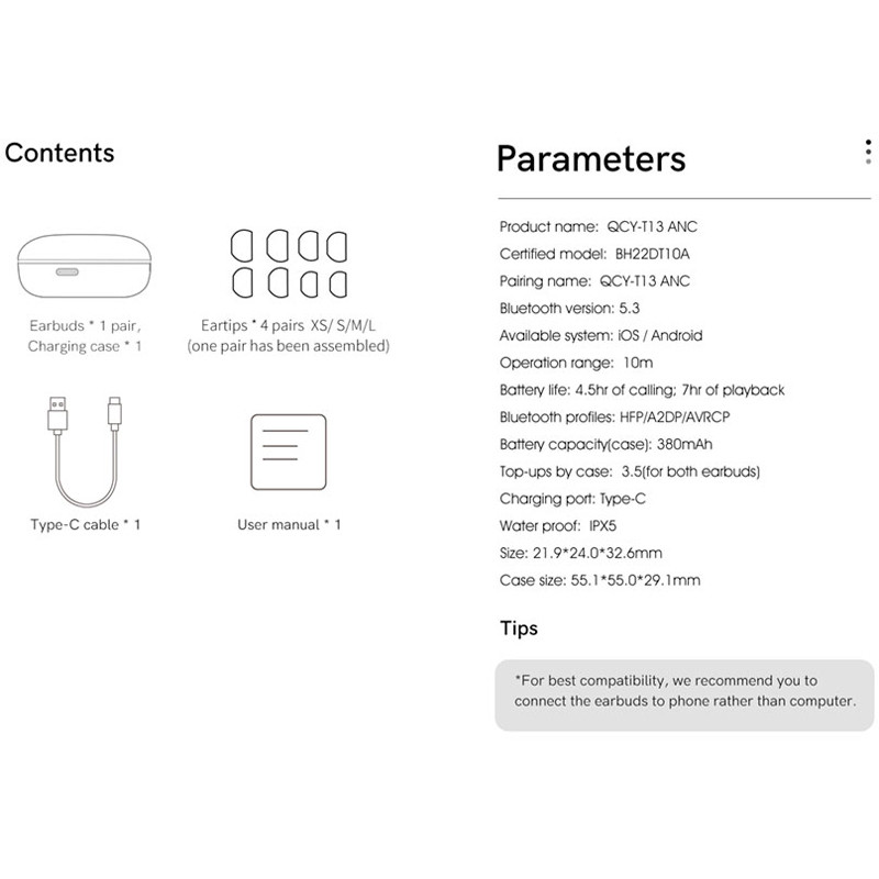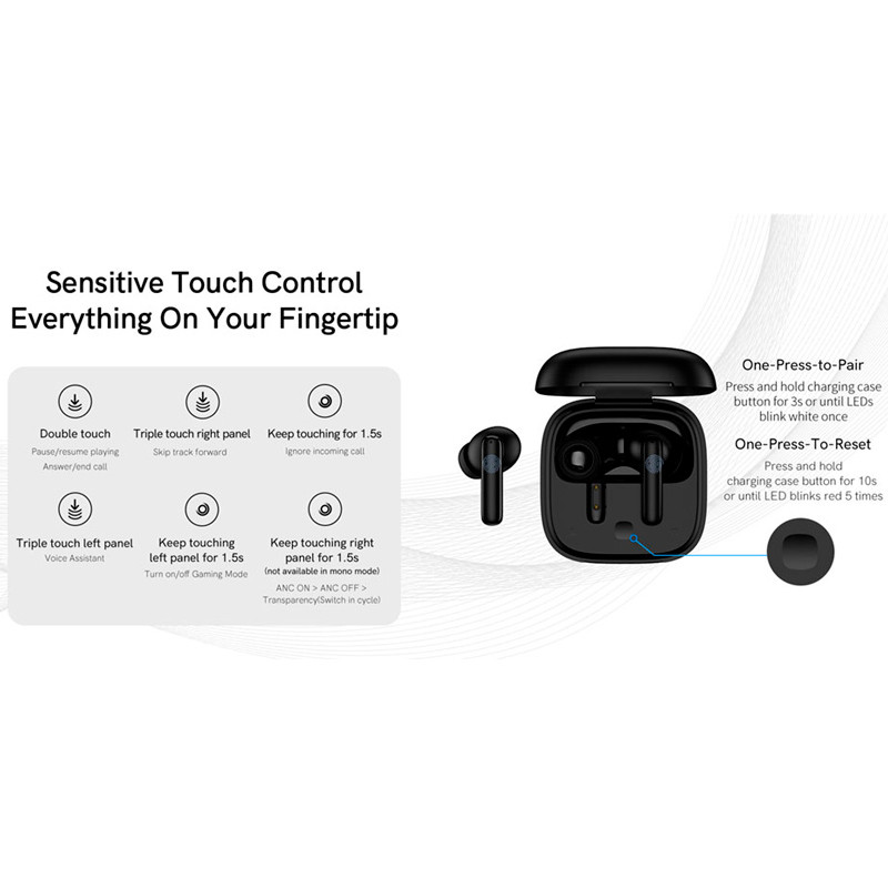 یکی از مهترین ویژگی های ظاهری این نوع از محصولات می تواند طراحی ساخت آن و نحوه قرارگیری در گوش باشد. هندزفری QCY T13 ANC با طراحی ارگونومیکی و برخورداری از سری های سیلیکونی این امکان را به شما می دهد که بدون نگرانی از سر خوردن و افتادن گوشی ها، به تجربه لذت بخش خود از این هندزفری بلوتوثی ادامه دهید. بارها برای همه ما پیش آمده است که در حال انجام کاری هستیم و برای جواب دادن به تماس نمی توانیم به تلفن همراه مراجعه کنیم. پنل لمسی تعبیه شده روی بدنه هندزفری بلوتوثی T13 ANC، قابلیت پاسخ، رد تماس و تنظیم ولوم صدا را به شما می دهد. دیگر ویژگی مهم این هندزفری وزن سبک و اندازه جیبی آن می باشد که امکان حمل راحت و بدون دردسر آن را می دهد. چراغ LED، وضعیت شارژ هندزفری را به کاربر اطلاع می دهد تا در صورت نیاز به شارژ، کاربر از طریق پورت تایپ سی تعبیه شده روی بدنه، اقدام به شارژ کیس کند. دو عدد سوزن فلزی طراحی شده در کیس این امکان را به کاربر می دهد که تنها با قرار دادن گوشی ها داخل کیس، آن را شارژ کند.