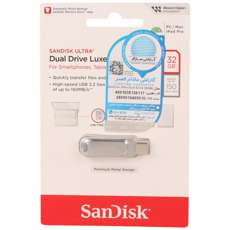 فلش 32 گیگ سن دیسک SanDisk Ultra Dual Drive Luxe OTG Type-C USB3.2
