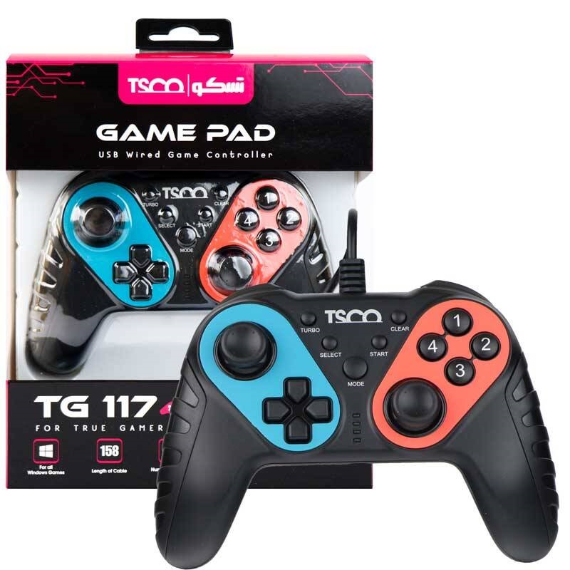 دسته های بازی در انواع مختلفی وجود دارند و بنا به کیفیت و امکانات باهم متفاوت هستند. یکی از این دسته ها که می تواند برای تمام کاربران مناسب باشد و آن ها را راضی نگه دارد دسته بازی TG117 می باشد. دسته بازی تسکو مدل TG117 سازگار با PS3 و PC می باشد یعنی شما می توانید از این مدل دسته ها برای بازی کردن با سیستم و PS3 استفاده نمایید. این دسته از طریق کابل USB به دستگاه وصل می شود که طول کابل آن ۱۵۸ سانتی متر می باشد و محدودیتی برای جابه جا شدن شما ایجاد نمی کند. بر روی بدنه دسته ۱۷ عدد کلید طراحی شده است و دو شوکر و یا موتور های ویبراتوری تعبیه شده است که شما را کاملا با حس تیر خوردن و انفجار درون بازی درگیر می کند و باعث هیجان در بازی کردن می شود. این دسته از دو رنگ آبی و نارنجی طراحی شده است که برای تمام سلیقه ها زیبا به نظر می رسد. . دسته بازی TG117 از شرکت تسکو دارای طراحی ارگونومیک است و کلید هایی بسیار نرم و با کیفیت دارد که در برابر ضربه نسبتا مقاوم می باشد. این دسته از ابعاد ۱۵۵*۱۱۰*۵۵ میلی متر ساخته شده است که اندازه مناسبی بوده و به راحتی در دست جای می گیرد.