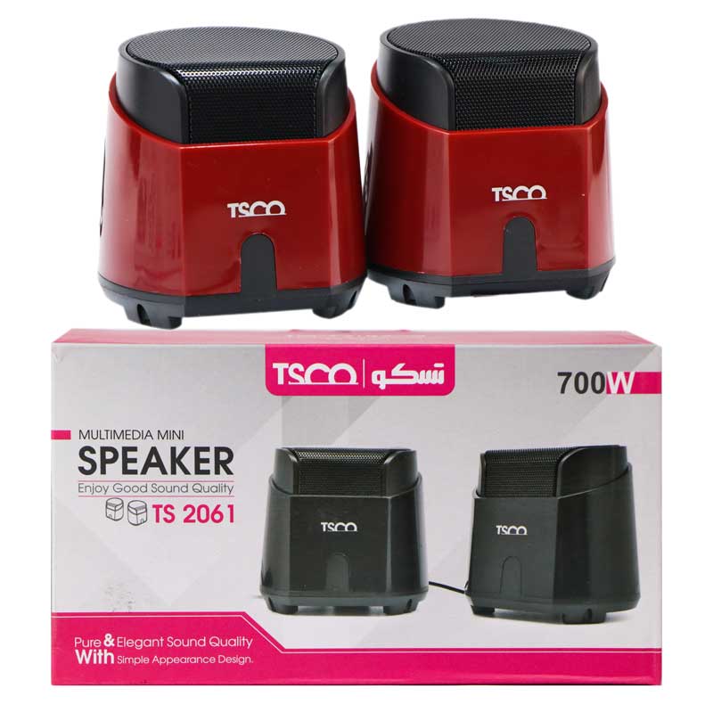 اسپیکر با سیم دو تکه TS 2061 از تسکو مناسب استفاده دستکتاپ بوده و به دلیل داشتن ابعاد نسبتا کوچک خود فضای زیادی از میز را اشغال نمی کند. بدنه TSCO اسپیکر از متریال مرغوب و با کیفیتی ساخته شده است و همین عامل سبب شده تا در برابر فشار و ضربه احتمالی مقاومت مطلوبی از خود نشان دهد. بر روی کابل اسپیکر تسکو کلید فیزیکی جهت افزایش و کاهش حجم صدا تعبیه شده است و اتصال باسیم اسپیکر تسکو به کامپیوتر، لپ تاپ و دیگر دستگاه ها از طریق کابل AUX انجام می گیرد. پخش کننده صوتی تسکو به دو بلندگو با حداکثر توان خروجی ۶ وات مجهز شده است که با پشتیبانی از حساسیت سیگنال به نویز ۸۰ دسی بل و فرکانس پاسخ گویی در رنج داینامیکی ۹۰ هرتز تا ۲۰ کیلو هرتز قادر به پخش صدایی باکیفیت و شفاف از هر سبک موسیقی می باشد. اسپیکر دو تکه TS 2061 انرژی مورد نیار خود را از طریق پورت USB موجود بر روی بدنه و اتصال کابل تامین می نماید.