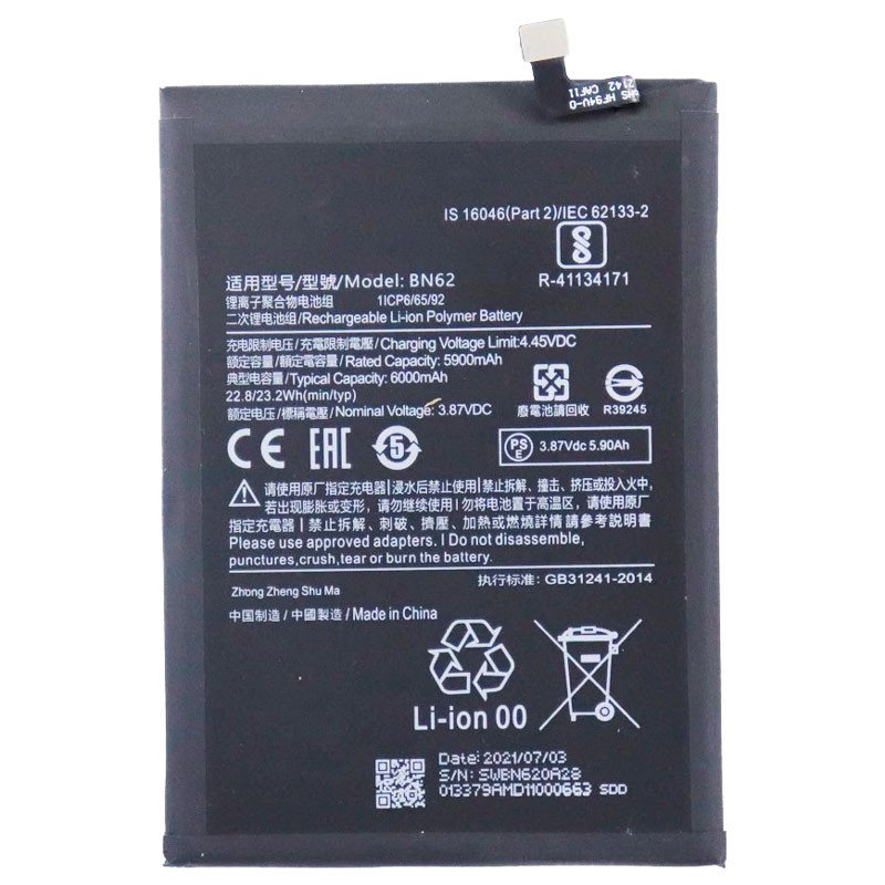 نوع باتری لیتیوم-یون پلیمری با ظرفیت 6000 میلی آمپر ساعت و ولتاژ ۳٫87 ولت، سازگار با گوشی موبایل شیائومی Poco M3 / Redmi Note 9 4G / Redmi 9T